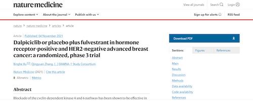 11月4日,国际四大医学期刊之一、英国《自然》旗下《自然医学》(Nature Medicine)在线发表CDK4/6抑制剂达尔西利(SHR6390)联合氟维司群治疗既往内分泌治疗后疾病进展的HR+/HER2-晚期乳腺癌的多中心、随机、双盲III期临床研究(DAWNA-1研究)中期分析结果报告,首次对氟维司群(雌激素受体降解剂)±达尔西利治疗激素受体阳性晚期乳腺癌的有效性和安全性进行了比较。研究结果显示,达尔西利+氟维司群组与安慰剂+氟维司群组相比,无进展生存期(PFS)显著延长。该项研究由中国医学科学院肿瘤医院徐兵河教授担任leading PI,全国39家医院参研,由AG亚游医药临床研发团队支持完成。